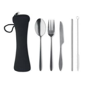 Wiederverwendbares Besteck-Set mit Messer, Gabel, Löffel, Trinkhalm und Bürste aus Edelstahl im Neopren-Beutel.