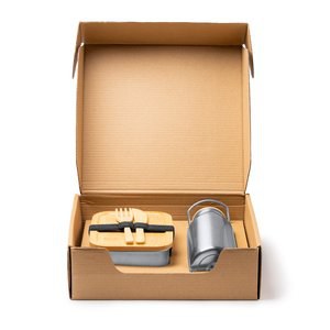 Lunchpaket mit Besteck und Flasche.